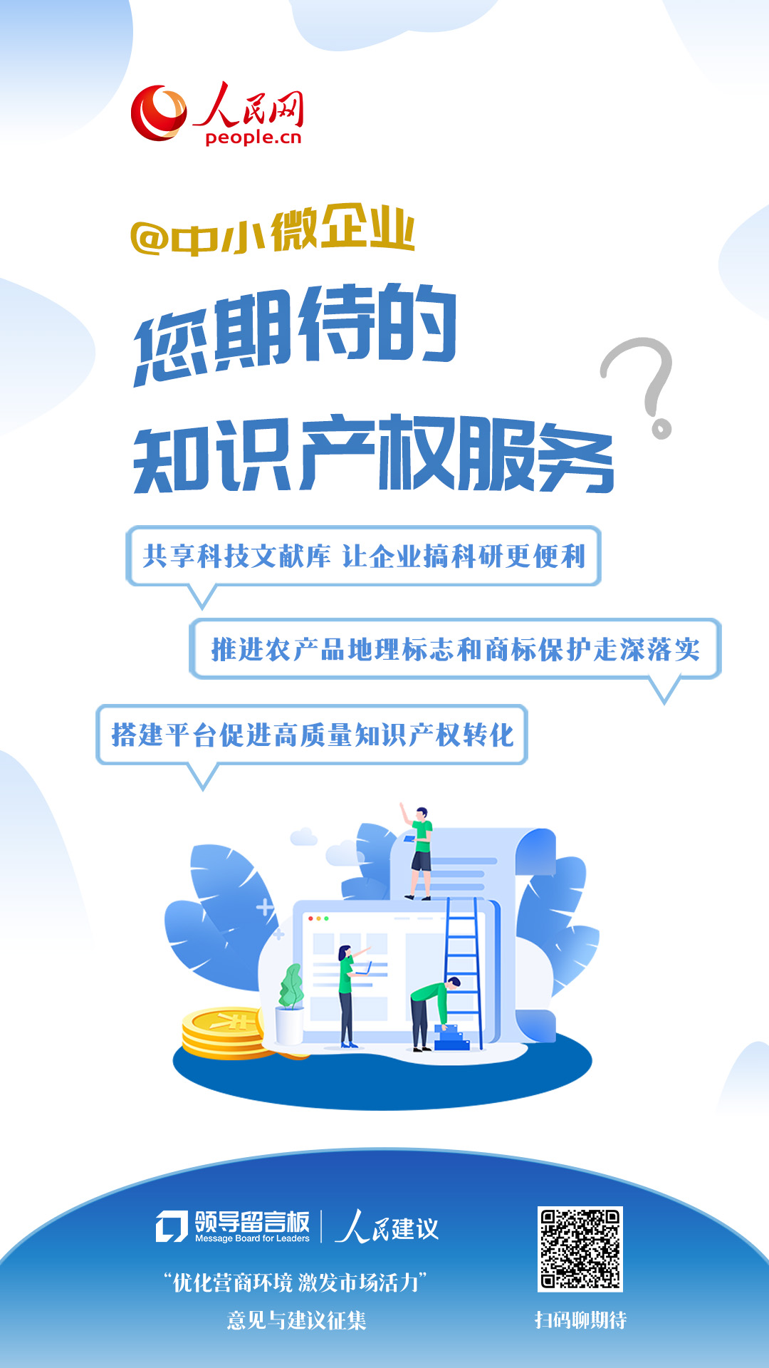 各位中小微企业经营主体,您期待怎样的知识产权服务?“优化营商环境激发市场活力”意见与建议征集(点击参与)持续进行中,诚邀您来聊期待说建议。(实习生贺雨婷对本文亦有贡献)