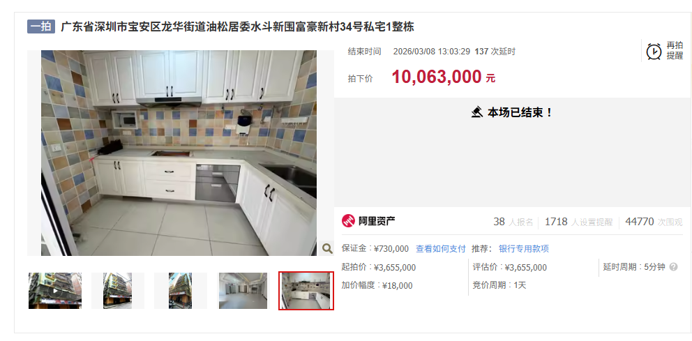 近日,深圳龙华油松社区水斗新围富豪新村的一栋7层法拍私宅成交,起拍价为365.5万元,最终成交价达到了1006.3万元,溢价率超过170%。根据标的物介绍表,此标的房地产证为深圳市房地产证“绿本”,涉及到深圳市房地产证绿本能否过户问题、是否具备符合购买资格(有无限购等规定)需竞买人自行到相关部门了解,交付时实物与现场看样不一致所产生的风险如隐藏瑕疵、缺陷、损毁等均由买受人承担。