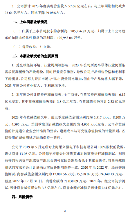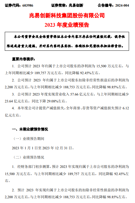 兆易创新(603986)1月25日晚间公告,公司预计2023年归属于上市公司股东的净利润1.55亿元左右,同比下降92.45%左右。公司预计2023年度实现营业收入57.66亿元左右,同比下降29.08%左右。受全球经济环境、行业周期等影响,2023年公司所处半导体行业仍面临需求复苏缓慢的严峻考验,同时行业竞争激烈,财盛证券导致公司产品销售价格和毛利率下滑明显。公司努力开拓市场,产品出货量同比增加,但由于产品价格大幅下降,2023年度公司营业收入、毛利出现下滑。2023年度公司计提资产减值损失,全年商誉、存货等资产减值损失预计6.12亿元左右。